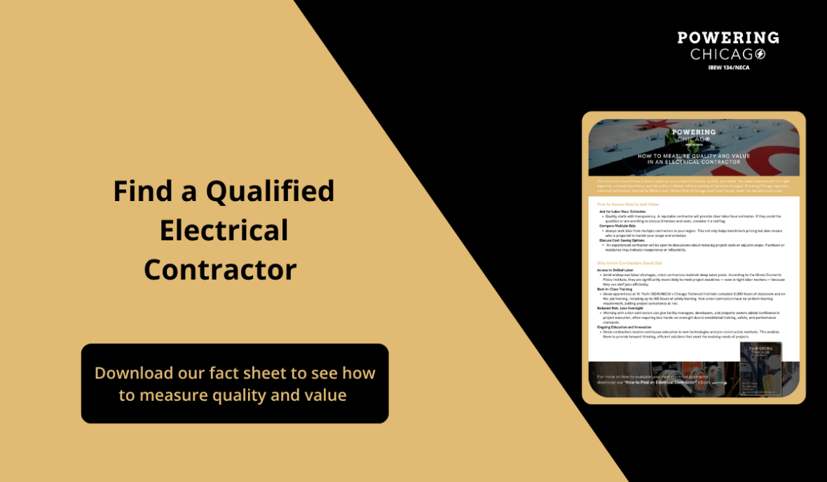 The electrical contractor you choose has a direct impact on safety, timelines, and overall project success. Powering Chicago’s Find a Contractor Fact Sheet outlines practical steps for evaluating quality and value, including reviewing labor hour estimates, comparing bids, and understanding how training and workforce depth reduce oversight and risk. It’s a useful resource for owners and managers planning upcoming electrical work.