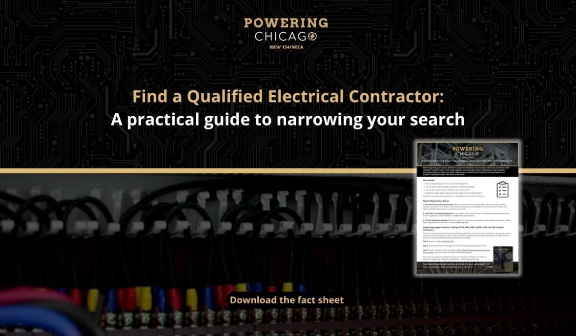 Choosing a qualified electrical contractor is essential to ensuring project safety, reliability, and cost control. Powering Chicago’s “How to find an Electrical Contractor” Fact Sheet simplifies the contractor selection process and reduces project risk by outlining steps and helpful information needed to make a more informed decision. The fact sheet covers topics including verifying licensing, safety records, project management approaches, and more.